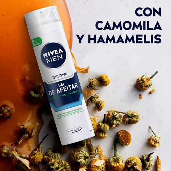 NIVEA MEN Sensitive Gel de Afeitar: protege la piel sensible de la irritación durante el afeitado. Su fórmula extra suave (sin alcohol) enriquecida con Camomila y Hamamelis cuenta con la innovadora tecnología Ultra Glide que asegura un deslizamiento suave de la cuchilla para un afeitado apurado y libre de irritaciones. Prepara la piel sensible para un afeitado comfortable: Sensitive Gel de Afeitar.