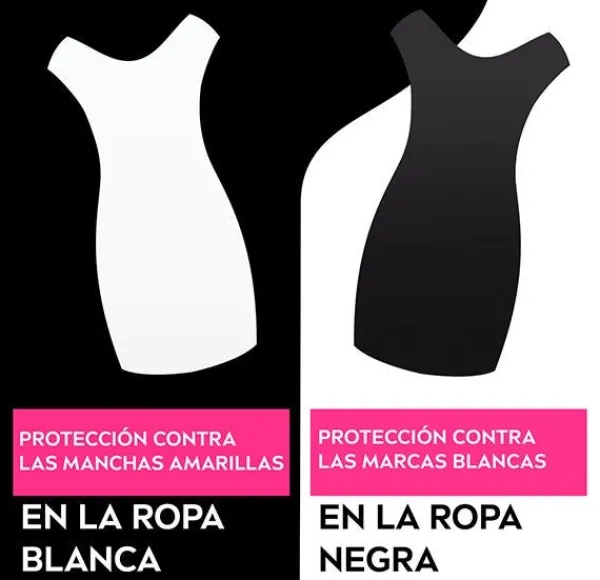 Su fórmula ofrece 5 acciones: bloquea el OLOR con su poderosa fragancia, evita el SUDOR con 48 horas de eficacia antitranspirante, protege contra las MANCHAS para mantener el color original de la ropa blanca y oscura, no deja RESIDUOS en la piel ni en la ropa y previene las IRRITACIONES de la piel ya que ha sido comprobado dermatológicamente.