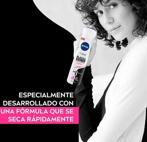 NIVEA Black & White Invisible Original Spray ofrece 48 horas de protección antitranspirante cuidando la piel.
