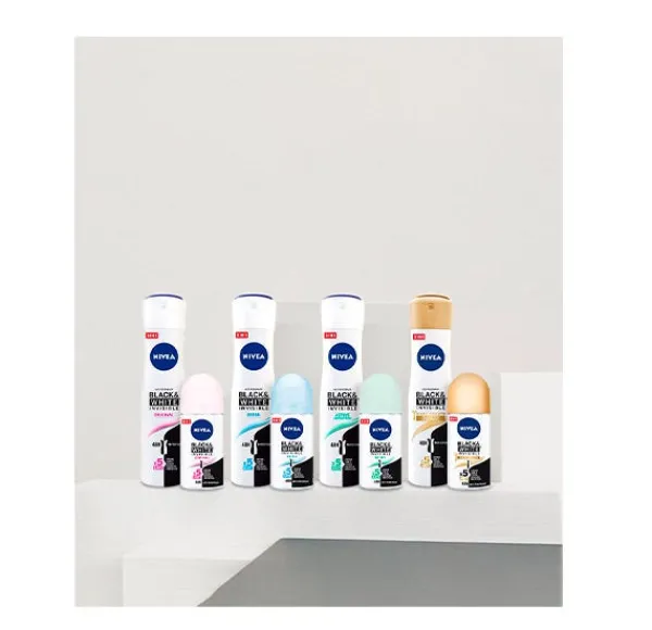 NIVEA Black & White Invisible Fresh Spray: Su fórmula ha sido desarrollada con la ayuda de expertos en productos textiles (“Hohenstein International Textile Institute”) con el fin de ofrecer una potente protección anti-transpirante que evita la aparición de manchas blancas en la ropa negra y reduce la aparición de marcas amarillas en tu ropa blanca. Garantiza 48 horas de protección anti-transpirante con una fragancia fresca. Su formato spray deja una sensación refrescante sobre la piel con un aroma duradero: Black & White Invisible Fresh Spray.