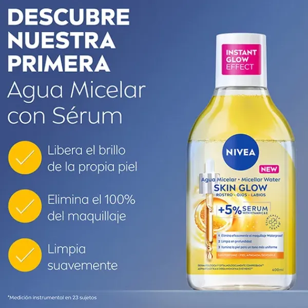 NIVEA Agua Micelar Skin Glow para pieles apagadas y sensibles, elimina eficazmente el maquillaje waterproof, limpia en profundidad e ilumina la piel para un tono más uniforme, sin dejar residuos grasos. Su fórmula con un 5% de Sérum con Vitamina C y E y Amino Acid Complex, energiza e hidrata la piel. Elimina el maquillaje, las impurezas y la suciedad en unas pocas pasadas y sin necesidad de frotar. Su fórmula iluminadora es compatible con la piel y los ojos y está dermatológica y oftalmológicamente comprobada.