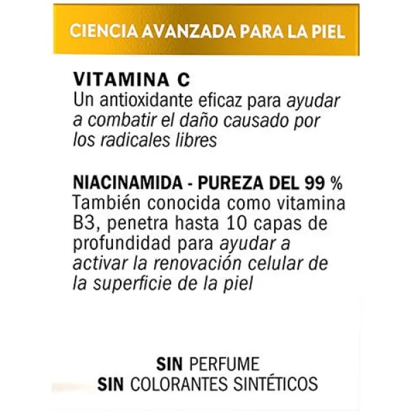 Fórmula elaborada con vitamina C, vitamina B3 y péptidos que ilumina, hidrata y mejora visiblemente la apariencia de la piel.