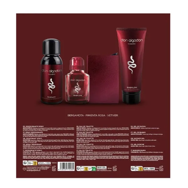 Desata tu lado más salvaje con el Set de Regalo Babylon de Don Algodón. Incluye la fragancia Babylon de 30 ml, gel de ducha 75 ml, desodorante en spray 100 ml y tarjetero metálico. Un set completo para hombres que viven con intensidad.