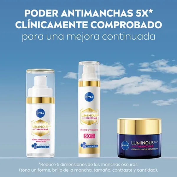 NIVEA Cellular Luminous630 Antimanchas Sérum Tratamiento Avanzado, el sérum Antimanchas Nº1 de NIVEA (en la selección de sérums de NIVEA), es un eficaz tratamiento de textura ligera que previene la aparición de manchas y las reduce sin importar su tipo, como las causadas por la exposición solar, el envejecimiento y cambios hormonales como el embarazo y la menopausia. Desde el primer día de uso, el ingrediente patentado LUMINOUS630® actúa en la piel a nivel celular para reducir las manchas. En 2 semanas, las manchas se aclaran visiblemente. En 12 semanas, la intensidad de las manchas se reduce en un 71% (Autoevaluación, estudio de 12 semanas con 34 mujeres, 2018). Con el uso regular de producto, se produce una mejora continua en la prevención de la aparición de manchas y la reducción de su intensidad (Estudio de 12 semanas).