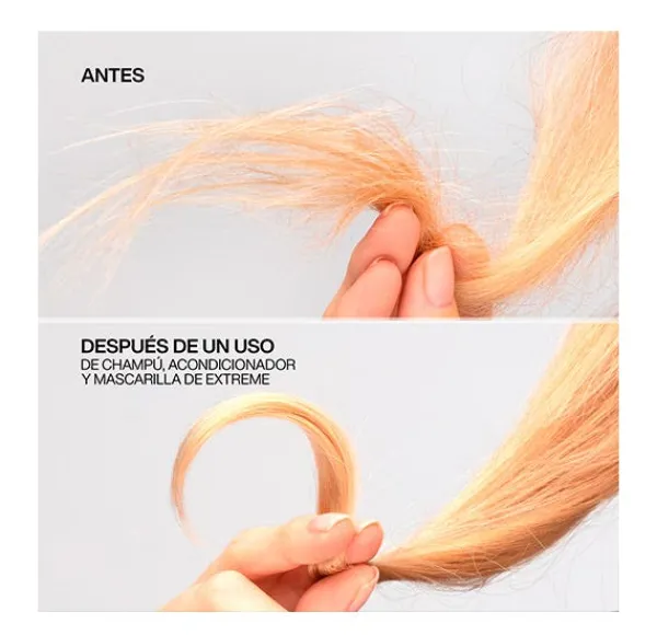 Al mismo tiempo, refuerza y repara la estructura del cabello. No aporta peso.