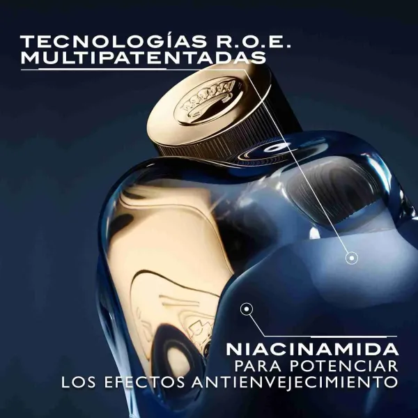 Este sérum facial, que combate 8 daños causados por el fotoenvejecimiento*, está enriquecido con tecnologías R.O.E. multipatentadas. El Retinol Liposomal Catiónico (R) ayuda a potenciar la producción natural de colágeno de la piel, el Oxígeno en Matriz (O) ayuda a renovar las células de la piel, y las Enzimas Liposomales Dobles Reparadoras de la Piel (E) ayudan a reparar los daños de origen múltiple en el núcleo de las células y aceleran la capacidad de autorreparación de la piel. Para reforzar aún más la barrera cutánea y calmar la piel, este sérum incluye el potente VitE-Mega, niacinamida y prebióticos.