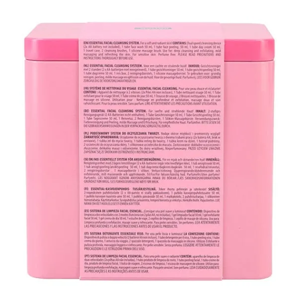 El pack de seis piezas contiene un dispositivo de limpieza de doble velocidad que puede ajustarse a bajo o alto, dos brochas de limpieza, una brocha de masaje, un tratamiento peeling 50 ml, un facewash de 50 ml y una crema de día para finalizar la rutina.