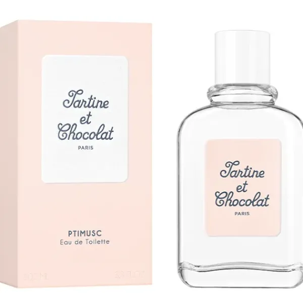 el frasco de Ptimusc es totalmente transparente. Los suaves tonos rosas reflejan la delicadeza del Eau de Toilette. La forma atemporal del icónica frasco Tartine et Chocolat ahora se elabora con un 15% de vidrio reciclado. La fórmula del Eau de Toilette contiene un 96 %* ingredientes de origen natural.