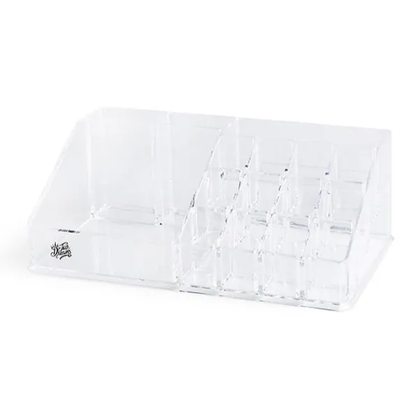 Mantén tu maquillaje y accesorios bien ordenados con este organizador de metacrilato transparente que incluye: seis compartimentos para labiales, dos cubiletes para brochas y un espacio multiusos para esponjas, pintauñas, gomas de pelo…