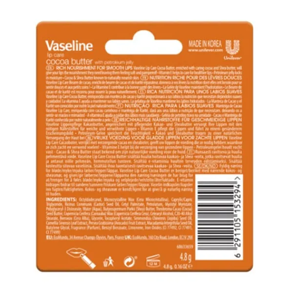 Bálsamo labial para suavizar los labios secos dándole la nutrición que necesitan, con vaselina pura y rica manteca de cacao.