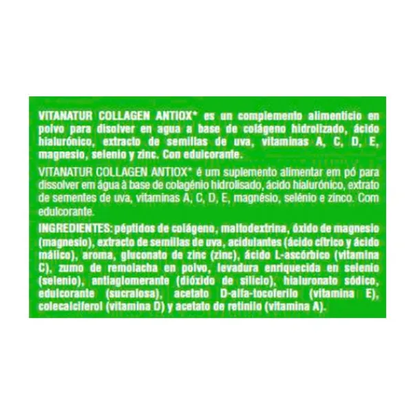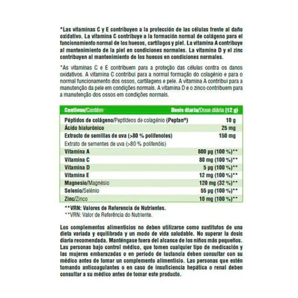 Complemento alimenticio, a base de colágeno hidrolizado (Peptan®), ácido hialurónico, extracto de semillas de uva, vitaminas A, C, D, E, magnesio, selenio y zinc, que gracias a sus ingredientes ayuda mantener el buen estado de la piel, huesos y articulaciones y a proteger las células frente al daño oxidativo.